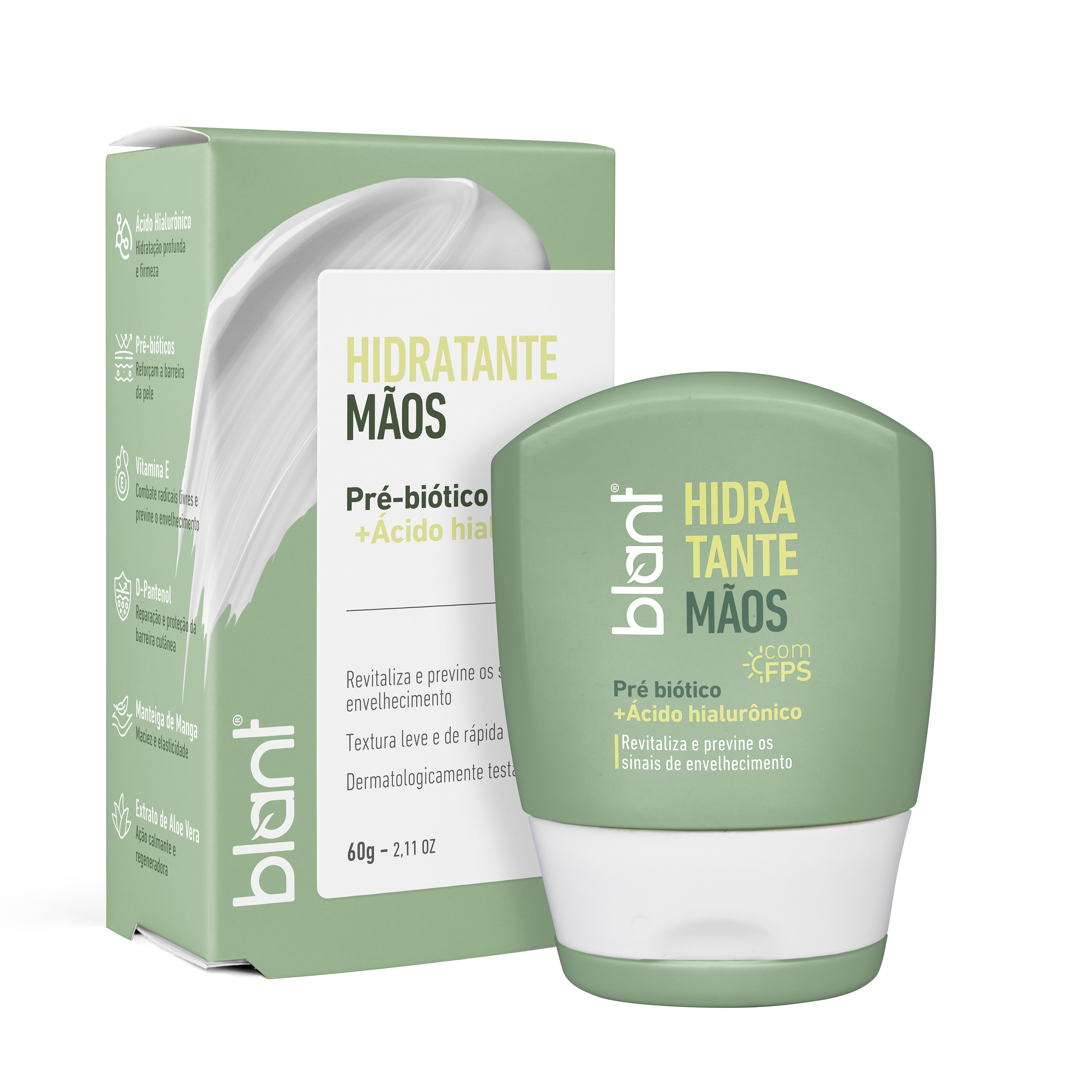 Com Ácido Hialurônico, D-Pantenol e Vitamina E, o Hidratante Revitalizante Blant mantém as mãos macias, protegidas e livres do ressecamento, com textura leve e rápida absorção.