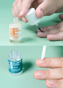 1° Modo de uso da Base Amarga: Agite bem o frasco e aplique uma fina camada sobre a unha já limpa, seca e sem a esmaltação.