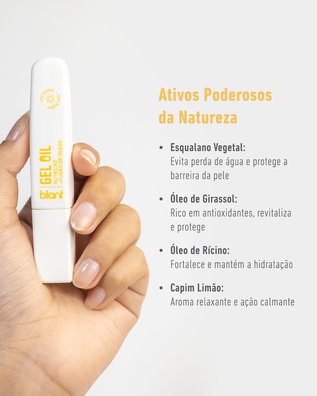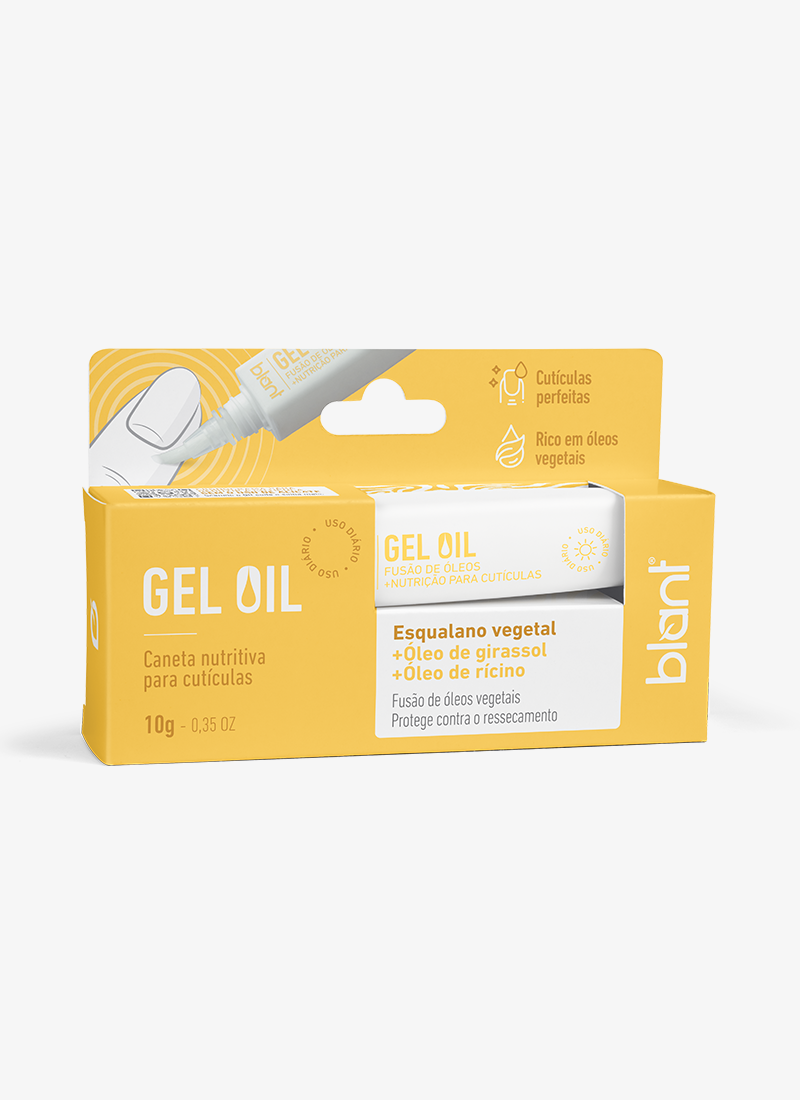 Gel Oil é uma fusão de óleos vegetais que proporciona nutrição intensa, regeneração e proteção contra o ressecamento das cutículas. Sua fórmula concentra ingredientes poderosos como o Esqualano, que forma um filme protetor e evita a perda de água da pele. Já os óleos vegetais de Girassol e Rícino, combinados ao óleo essencial de Capim-Limão, criam uma barreira natural que mantém as cutículas saudáveis, hidratadas e macias todos os dias — tudo isso sem abrir mão da praticidade e do conforto.