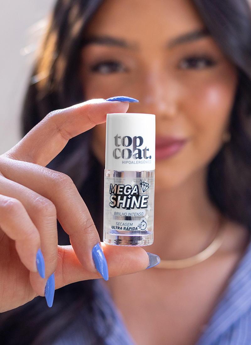 Após 2 camadas secas do esmalte Coretrat, aplique uma camada do Top Coat Mega shine em toda unha.